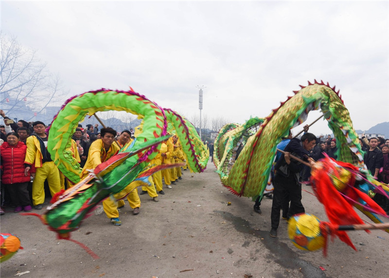 2月24日,贵州省铜仁市松桃苗族自治县春节联欢活动在寨英镇大水沟村举行,当地群众按传统习俗舞滚龙欢度新春