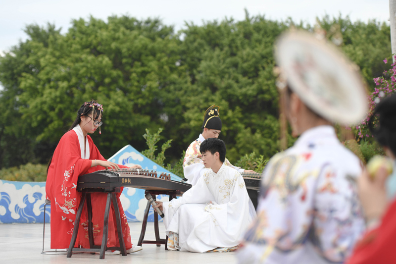 12月22日,汉服爱好者在福州左海海底世界演奏古筝