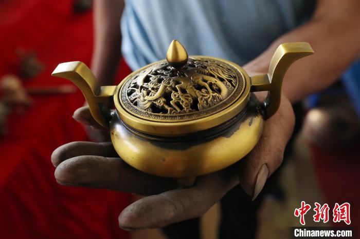 定西市铜铝翻砂铸造非物质文化遗产传承人蒋胜平正展示他铸造的铜器。 于晶 摄