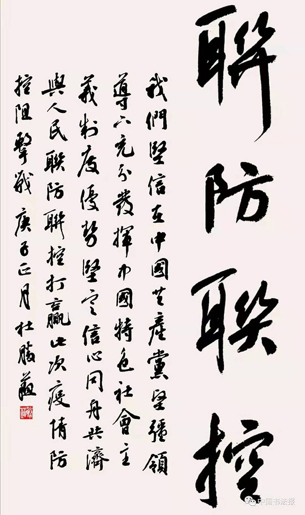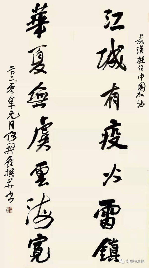 释文:众志成城排肺疫,同心戮力送瘟神。