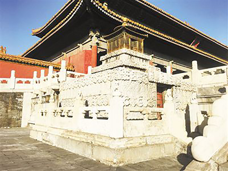 作为紫禁城内“袖珍”版宫殿,金殿边长仅约1米、总高仅约1.4米,但建筑整体造型精巧细致。支撑金殿的两层石台由下往上依次收进。其中,下层石台边长约4米,高1.95米,坐落在0.3米高的基座上,为单层小屋,分析为存放祭祀用品之用;上层石台立于下层石台屋顶之上,边长约1米,高约1.2米,外观由六层凸凹相间的条石堆叠而成。两层石台外立面均满刻精美纹饰,与富丽堂皇的宫殿氛围相呼应。