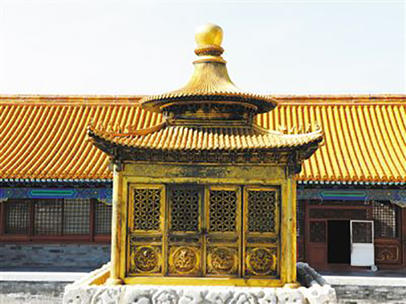 紫禁城乾清宫前的东西两侧,各有一座铜制的亭式建筑,均矗立在二层石台之上。两座建筑的造型和尺寸完全相同,且为紫禁城里体量最小的宫殿。其中,乾清宫东侧的宫殿称为江山殿,西侧的宫殿称为社稷殿,合称为江山社稷金殿。在这里,“江山”是指江河和山川,寓意国家政权;“社稷”是指谷神和土地神,寓意国土。清代官书《日下旧闻考》卷十三所载“(乾清宫)东西丹陛之下有文(纹)石台二,上安设社稷江山金殿”,可说明江山社稷金殿名称的来源。另据《大清世祖章皇帝实录》记载,顺治十三年(1656)五月,顺治帝下令安设江山、社稷神位于乾清宫前,并派遣官员祭祀。以上说明,江山社稷金殿是古代帝王用于祈求长久“执掌天下”的祭祀性建筑。