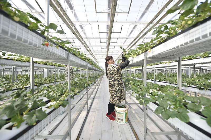 12月7日,工人在山东省聊城市茌平区贾寨镇耿店村绿隆农业科技有限公司智能温室大棚里管理草莓。